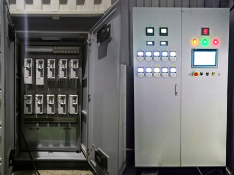 下图为天津海水淡化项目等plc变频器控制柜,此控制柜是同水处理设备一同安装于集装箱内。控制系统可以将集装箱内所有的水处理设备全部连接起来。plc柜触摸屏画面直观的展现整个水处理设备的运行状态,以及各个设备间的关系。
